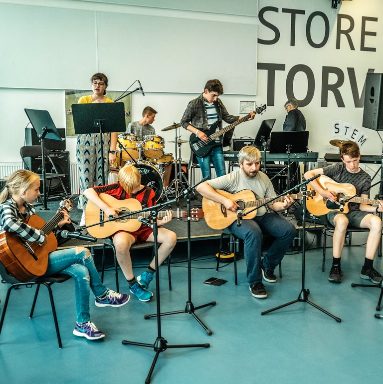 Sammenspil og Kor er holdundervisning hvor eleverne spiller og synger med hinanden i bands og kor